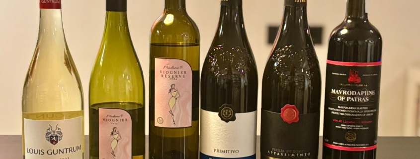 Gestart werd met Duitse bubbel (Guntrum Perlfein), daarna twee Franse witte prijswinnende aspergewijnen van eigen wijnhuis (Madame P. Viognier en Viognier reservé), vervolgens twee Italiaanse rode wijnen (Extroso Primitivo en Appassimento) en tot slot een verrassende Griekse afsluiter, een rode dessertwijn (Mavrodaphne of Patras).